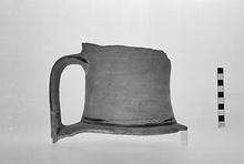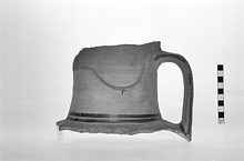 | Description: | A single fragment preserves part of the neck and shoulder, and one handle. The mouth is entirely missing. Rather broad handle decorated with two long diagonals and between them a wavy vertical line (snake). Around base of handle, a line of glaze; around base of neck, two; elsewhere reserved. | |