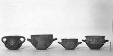 | Description: | Entire bottom, most of one handle and part of lip missing. A deep open cup with slightly offset lip and two horizontal handles. Outside of lip reserved and decorated with dots, above a band. Inside of handles reserved. Black glaze, rather thinly applied, inside and out. | |