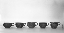 | Description: | Fragments of rim, body and bottom missing; restored in plaster. A deep open cup with small sharply out-turned lip and flat reserved bottom. Handle reserved, and decorated on the outside with groups of lines, horizontal or vertical. Thin black to brown glaze. | |