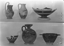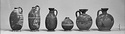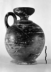 | Description: | Mended from three fragments. Lip chipped so that none of its rim is preserved. Otherwise vase complete save for several small holes. Short neck rises from a disk of slight elevation on top of the globular body. Spreading ring foot. Glaze thin and partly fired red over all visible parts save underside, and part of handle near mouth. | |
