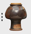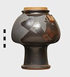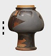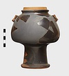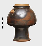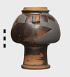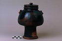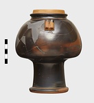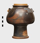 | Description: | Much missing from one side, with one lug handle. Torus foot, flat beneath; rim flanged inside for lid; double lugs, vertically pierced, attached at shoulder. Good black glaze, somewhat mottled and worn outside, except for outer edge of flange, lower part of lugs, and bottom; scraped line at junction of rim and neck, and of stem and base. Inside, dull black. | |