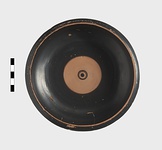 | Description: | Complete. Wide shallow bowl on substantial ring foot. The wall set off from the down-sloping lip by a reserved groove; also reserved: the foot, the inner edge of the lip and the center of the floor with single circle and dot. | |