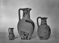| Description: | Complete except for part of lip, restored in plaster. Flat base; slender eggy body; tall neck narrowing slightly below trefoil lip. Coarse buff clay; streaky black to brown glaze, much worn, over all except on bottom. | |