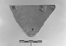 | Description: | Fragment from edge of heavy flat tile. Incised on top after tile had been broken: <graphic> Unglazed. | |