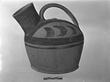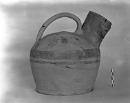 | Description: | About half the lip of the spout and a small piece of the wall missing. Broad squat pot on very low ring foot; walls nearly vertical; the top domed, finished at the center with a low button. Wide, slightly flaring spout, with plain lip, set at an angle on the upper shoulder. Askos handle. Clay gray at core, pink to buff at surfaces; light slip. Spout and top of handle glazed, thin red to brown; a broad and a narrow band around the shoulder, and two arcs on the top; three crescents inside each. | |