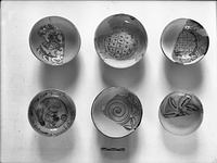 Description:   Base and about one-half of the bowl preserved. Rather high ring foot in two degrees; shallow bowl; plain rim. Outside has dark purplish-brown glaze; inside has light green glaze, beneath which a spiral design in dull blue, with a band of linked ovals in blue and brown, with traces of green around the sides.