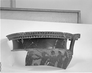 Description:   Nearly three-quarters of the circle of the neck preserved with half the rim, including most of one handle and the start of the other; also part of the shoulder and wall on one side, with the upper parts of five figures. Linked buds on upper face of lip; double lotus and palmette on handle panel; ivy band on vertical face. Tongues on shoulder, alternating red and black, above figured panel; ivy band at sides. Figures, from left to right: two bearded boxers, with bound fists, facing each other; then a cloaked beardless figure, left; then a nude bearded figure, right, facing a cloaked bearded figure.
