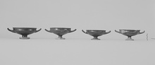 | Description: | Mended from nine pieces. Base complete, one handle preserved and rather more than half the rim. Reserved: inside handle and between attachments, edge and resting surface of foot, top of stem underneath, which is finished and decorated with circle and dot. Good solid black glaze. Cup for the most part evenly fired, the reserved part of the foot showing a bright red. Around stem just above foot, relief band. Cf. Agora XII, no. 412. | |