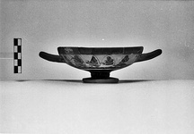 Description:   Mended from ten pieces. Base complete and more than half of rim preserved but both handles missing save one attachment. Incised solid palmettes in handle zone. Added white in dots around core of palmettes and in tongues between them. Reserved portions of pot as on P 1308; center inside decorated with single circle.