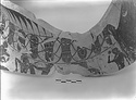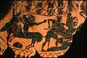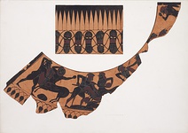 Description:   Slightly more than one-half of neck and shoulder, with one handle, of a massive bauch-amphora. Mended from many fragments. Decoration on one side only. On neck, rays, pointing down; below, interlaced lotus and palmette band. On shoulder, below figured zone, linked buds. In the figured zone, which extends across the shoulder from handle to handle, battle of Lapiths and Centaurs, fighting in pairs. Elaborate and careful incision; free use of added red, for hair, beards, shields, rocks, etc., and in the borders.
