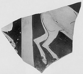 | Description: | Fragment from floor. Interior: within stopped maeander, part of the back of the head and shoulder of a boy/jockey(?) with long hair. Exterior: parts of two horses, right; a column or stele between them. Relief contour. | |