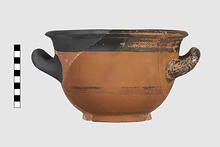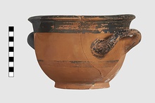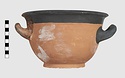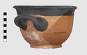 | Description: | About one-half remains, with one handle. Steep wall; thickened and flaring rim. The bowl appears to have warped in making for the rim appears to be oval, not round. Good black glaze on inside, around the upper wall outside, on the handle and in bands around the base ring and at mid-height. | |