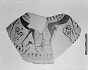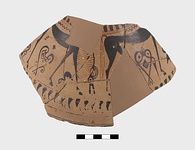 | Description: | Much of one side remains with part of the rim. Deep conical lid; plain rim. A band of horses, grazing to right. An elaborate palmette and scroll ornament under each horse, a few scattered smaller filling ornaments, and zigzags above. Above the band three brown lines, then a zone of broad black verticals. Below, a zone of hooks, between narrow lines. Two lines at edge of lip. Solid horse silhouette save for reserved eye, hatched mane and curly forelock, and three-strand tail. Soft pink to buff clay and black glaze; inside plain. | |