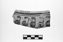 | Description: | Fragment of rim and upper wall. On rim are groups of transverse bars. Around the upper wall a band of warriors with helmets, shields and spears, to left, possibly in a boat. Solid silhouettes save for the heads which are done in outline with dots for the eyes. Thin brown glaze. | |