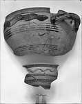 | Description: | Two large compound fragments from wall preserve a part of the lip. Steep wall, slightly out-turned rim. The wall is decorated inside and out with broad bands of brown glaze. Between the uppermost bands outside, a wavy line. | |