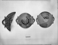| Description: | Handles and much of wall are missing; restored in plaster. Open bowl with slightly defined base, flat on underside. On the underside, in each quarter, a cross with dot, bordered by rings. On the outer wall are narrow horizontal bands with a zone of alternating vertical bars and zigzag at half its height and a zone of vertical bars around the top; on the rim are groups of transverse bars. On the inner wall, a single reserved line. Thin reddish-brown glaze. | |