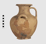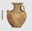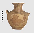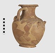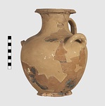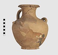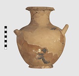 | Description: | One horizontal handle and many fragments of wall are missing; restored in plaster. Squat hydria on low base ring; sharply profiled rim. Gritty yellow clay; thin black glaze nearly all flaked away. | |