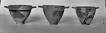 | Description: | Fragments of rim, wall and base missing; restored in plaster. Base rays; lip zone with groups of short zigzags between vertical bars; on the bottom a circle. Reddish-brown glaze. | |
