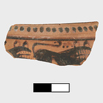 | Description: | Fragment from rim only. The wall is gently incurved at the mouth. A band of lions moves to right around the top of the wall; above them a row of dots. Cf. BSA 42 (1947), pp. 143 ff. | |