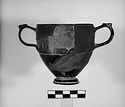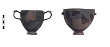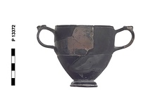| Description: | Much missing; restored in plaster. Moulded base and deep egg-shaped body with plain rim. Band handles with leaf thumb-rests. A scraped groove below the handle zone and one around the foot; a plain groove below the lip. Decoration of beribboned torches and dot clusters in thinned clay-paint and white. Rather dull black glaze. | |
