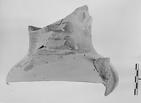 Description:   Four fragments, much mended, preserve part of neck and shoulder, with one upper and one lower handle attachment. On the shoulder, checkerboards and diminishing squares in terracotta paint and white; mask at handle attachment. On the neck, incised lines and spirals, with rosettes and a wavy line in white, and clusters in terracotta paint.