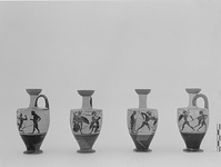 | Description: | Mended from many fragments; the neck, several pieces from the sides missing and chips from the base. Scene depicts two warriors fighting between two spectators. The lefthand warrior has pushed his opponent to his knee. The two spectators carry long staves (extra spears?). Added red for fillets, dots on garments and shields, baldricks and shield rims. On the shoulder, a row of short strokes around base of neck and interlacing ivy pattern. Cf. P 1354. | |