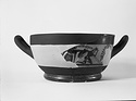Description:   Mended from ten pieces; preserved, the base ring, part of two opposite sides and a piece of the rim; part of one handle attachment. Figured scene depicts Athena and Enkelados. Reserved handle zone and narrow line round inside of lip. Palmettes beside handles. Rim curves out slightly at top.