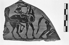 | Description: | Fragment from the neck of a large krater, preserving part of a Dionysiac revel. In the middle a naked rider on an ithyphallic mule, right. On either side, a satyr and a maenad struggling. Red for the rider's fillet, the satyr's beard and the mule's mane. A white stripe on the mule's chest and haunch and around the basket which hangs from his penis. Coarse incision. Shiny black inside. Dilute glaze wash on reserve surfaces. | |