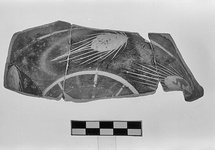 | Description: | Fragment from wall only. Outside, neat wheelrun grooves. Inside, decoration in added clay: on the floor, a many-spoked wheel, its rim a scraped groove. Above, a wreath of wheat, the beards incised. Red to black glaze. | |