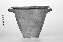 | Description: | More than half the rim, much of wall and the handle missing; restored in plaster. Very deep basin on ring foot; steep walls; narrow out-curved rim. Heavy horizontal handles just below rim. Coarse brownish clay; pale slip. Thin brown to reddish wash inside. | |