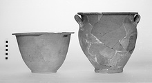 | Description: | Part of rim and wall with one handle missing; restored in plaster. Shape similar to P 13701 (ΛΛ 1340), but larger and with heavier ring foot. Decoration in thin reddish-brown wash on neck and shoulder; four horizontal bands, a zigzag between the two lower, on the shoulder; smears down handles. Coarse buff to reddish clay; light buff slip. ADDENDA P 13701: Deep eggy body on ring foot; wide mouth with short straight neck and flat projecting rim. Horizontal handles on shoulder, up-tilted. | |