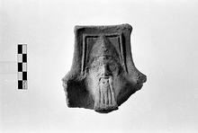 | Description: | Plastic brazier lug. Head in pointed cap, set in a rectangular grooved frame; projecting beard, grooved. Coarse micaceous red clay. | |