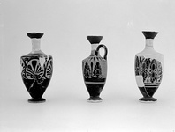 | Description: | Lip and foot missing. Decoration as on P 1381, but the glaze somewhat better preserved. ADDENDA P 1381: Four large palmettes on front of body not centerd to handle; on the shoulder degenerate lotus pattern; short strokes around the base of the neck. | |