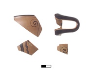 | Description: | The fragments do not join. a) Preserves part of the lip which curves outward slightly at the top, and at the right, the trace of a handle attachment; round the lip, two narrow glazed bands; below, a painted spiral. b) Wall fragment shows the knee and left hand of a nude male figure, standing right and grasping a long uncertain object, painted with added red on the longer portion and with white on the short end which projects from the hand. Careful incision for the interior details. c) Wall fragment with a painted spiral. d) Handle, black glazed outside, reserved inside; between the points of attachment, a bit of decoration(?). Inside, fine velvety black glaze; reserved line at lip. | |