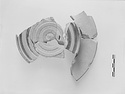 | Description: | Two large fragments made up of four and three pieces, respectively, give the complete profile of a flat plate with broad out-curved rim which merges below with a thin upright foot. The whole top of the plate is reserved save for three concentric circles in black glaze between which is the inscription, also in black glaze: <graphic> Underside of the lip reserved. Within the thin ring foot (glazed inside) are four broad concentric grooves, black glazed, the center sunken but reserved with circle and dot. The glaze is badly flaked especially on the top of the plate. The reserved parts show a fine finish (slip?). | |
