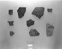 | Description: | From a large dish or plate, with thickened rim pinched up into a low horn. Pierced below horn at junction of wall and rim. Gritty clay, brown to gray; highly burnished slip, black to gray. | |