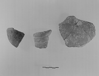 | Description: | Fragment apparently preserves the full height of a high foot ring or stand. Two horizontal grooves around outside. Gritty brown clay, gray at core; burnished red slip outside. | |
