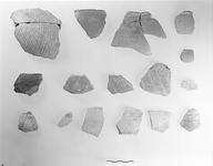 | Description: | From plain lip and wall of an open bowl. Hard gritty clay, light gray at core, pinkish at surface. Whitish or light buff slip; a band of black paint at lip, inside and out. | |