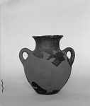 Description:   Very fragmentary but profile complete. Flat bottom; ovoid body; wide neck with plain splayed lip. Restored in plaster. One arched handle is preserved, round in section, high on shoulder.