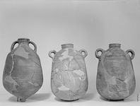 | Description: | Numerous fragments of body missing; restored in plaster. Bottom rounded with projecting knob; rather full pear-shaped body with point of greatest diameter quite low; shoulder slopes to short neck; rolled rim; narrow band handles from below rim. Ridges around shoulder. Brownish to red clay. Remains of light buff slip. | |