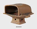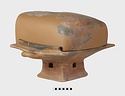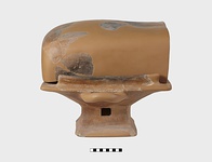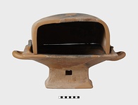 | Description: | Mended from many pieces and largely restored in plaster. Rectangular in shape with rounded corners and one open end. Double back wall; floor over front part only. The fragments give part of the top, with a finished edge along the open front, and part of the back, rounding from the top to a vertical wall with finished edge below. Preserved inside is the back left-hand corner of the floor, and inner back wall, which is set in about three centimeters from the outer wall, and extended only part way to the top of the object. Coarse red to brown clay, carefully surfaced; blackened from use inside. The fabric is exactly like that of the contemporary braziers on stands and, as made up, the oven fits neatly on the top of one of these braziers. Cf. P 2116 (Ι 386). | |