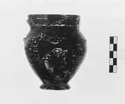 | Description: | Both handles and some pieces of side missing. Ovoid body; ridge between neck and plain thickened lip; plain base ring. Rather poor black glaze. | |