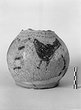 | Description: | All the neck, and part of the left side of the body missing; the lower attachment of a vertical handle preserved at the point of greatest circumference. Flat bottom left rough from wheel. The birds' bodies filled in with dark yellowish-brown glaze; their heads in outline sgraffito, with green dots for eyes and beaks. Green splotches on the foliage(?) between and beneath them. At the top of the shoulder, a sgraffito inscription: <graphic> Very pale greenish-white glaze over thin poor cream slip. | |