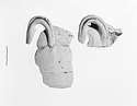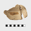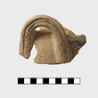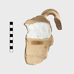 | Description: | Two fragments preserving both double rolled handles and part of the bottom. Straight side wall, inturned above the handle, glazed (once); and with reserved lunettes, filled by hand-drawn concentric half-circles, beside the handles. Flaky buff clay, much peeled. | |