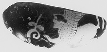 | Description: | From the shoulder of a small lekythos, unglazed inside. The top of the wings and tail, the lower hind legs, and the left front paw missing from sphinx. In front of the sphinx a volute, with three petals rising from it. Black glaze with metallic splotches, no relief contours. Dilute glaze for the inner wing feathers. | |