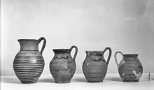 | Description: | The handle and bottom missing, with part of the wall; restored in plaster. Egg-shaped body forming continuous curve with short wide neck and flaring round mouth. On the shoulder, a wavy line ending in an arrow; the body decorated with triple sets of lines. Rim glazed outside. Soft yellow buff clay with many red bits; glaze black. | |