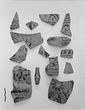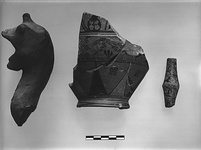| Description: | Fragment from a handle; double concave shape, probably the handle from a large lid. Broken at both ends. Decoration in zones, heraldic to a central line of alternating guilloche and zigzags. In the upper zone horses' feet; next sphinxes with uplifted paws; next horses; next sphinxes; lowest probably a horse. Buff clay, lustrous glaze. | |
