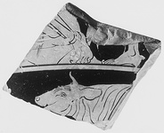 | Description: | From a large krater decorated with two zones. Upper zone: two feet left, one standing, the other draped and running, seen against a large object. A smear of red, as if from a wound, shows against the drapery. Below, the head and shoulders of a bull, left. Relief contours. | |