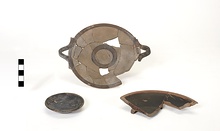 | Description: | Mended from several pieces; complete except for chip. Small shallow saucer, roughly made on the wheel. Dull black glaze. | |