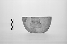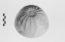 | Description: | Full profile preserved; part of rim and wall missing. In medallion, rosette; on the wall, elongated petals separated by jewelled lines; a central rib down the center of each petal; at base of rim, a band of small palmettes(?). Glaze almost entirely gone; where it remains, a dirty brown to red in color. | |